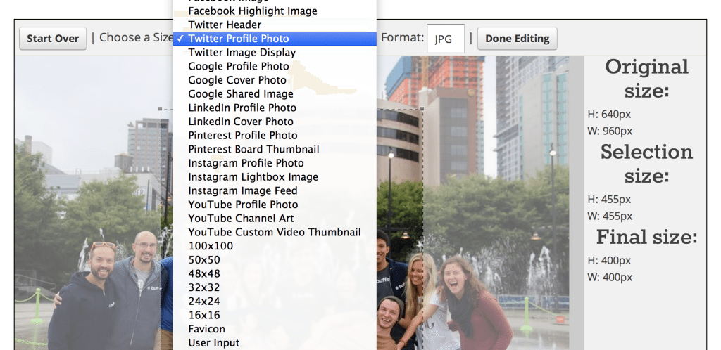 A huge number of different sizes and aspect ratios work best on different social networks. You can keep this all sorted with an image resizing tool like Social Image Resizer. Upload your desired image, then choose from a huge drop-down list of options and places where you might like to use the image. You can move and scale the selected area to grab the optimal look for your image.