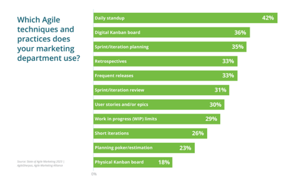Fortunately, nearly a decade of agile marketing learning can point you toward the most important and impactful operational improvements. The State of Agile Marketing report identifies the three most common techniques used by marketing departments – daily standup (42%), digital Kanban board (36%), and sprint/iteration planning (35%).