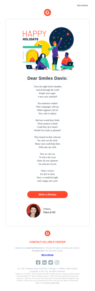 Let’s look at this email from G2, the peer-to-peer review company. Notice how it follows a minimalist design philosophy. The negative space makes the email easy on the eyes and the design makes the information easier to digest.