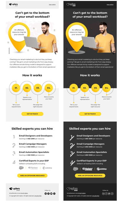 Here’s a great example of a dark mode email we sent to my company, Email Uplers. I’ve included the light version to show that the color palette and design are the same. The content is easy to consume in both modes and the CTAs are prominent.