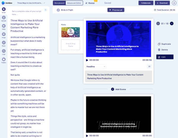 InVideo uses AI-driven automation to power its “text-to-video” feature. Copy and paste a few paragraphs from your article and upload your logo. The tool will come up with a video including a template, animations, and headlines. You can edit the video if you want.
