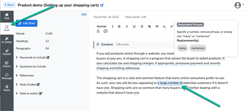 The tool also uses AI-powered grammar checks to help you (or your writer) create more readable, better-structured copy. In this example, the tool suggests changing “a large number of” to a specific number or using “many” or “numerous.”