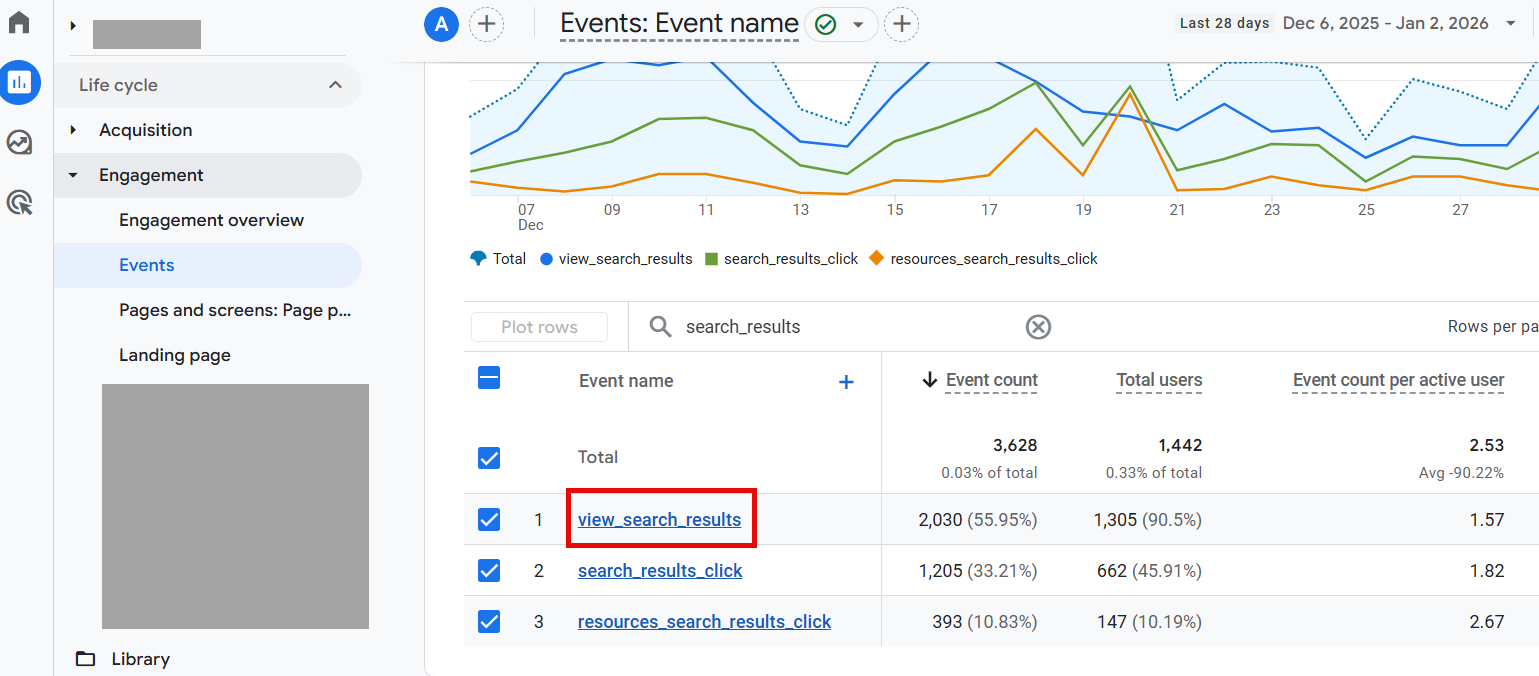 Search for the view_search_results event and click on it.