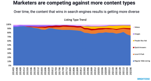 This chart illustrates that while regular listings still dominate, local three packs, quick answers, people also ask, images, and videos now make up about 25% of SERP.