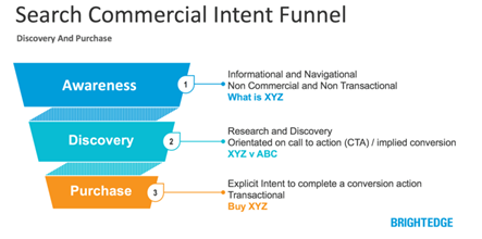 - Purchasing: explicit intent to complete a conversion action; transactional; buy XYZ