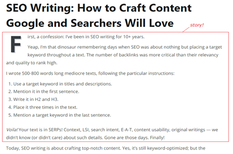 Sharing a personal story – reflective writing – in an introduction involves readers. I use this technique on Writing Breeze sometimes. For example, under the headline SEO Writing: How To Craft Content Google and Searchers Will Love, I write: “First, a confession. I’ve been in SEO writing for 10+ years…”