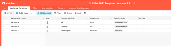 List your customer personas in the first tab on the far left of this template and fill in their most important characteristics. Jenny’s example shows details for three personas (A, B, and C), including their job titles, who they report to, and their role in the decision-making process.