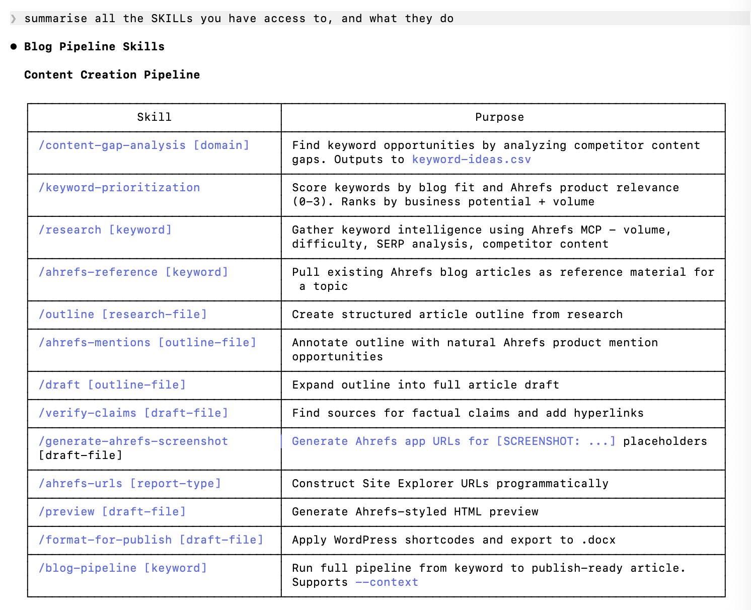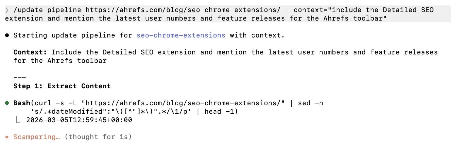 Whether I have convinced you or not, at the time of writing I have already outsourced significant parts of my role to generative AI. I use Claude Code, the Ahrefs MCP, and a set of ~15 custom SKILLs chained together in sequence to update old articles and create helpful, high-quality content.