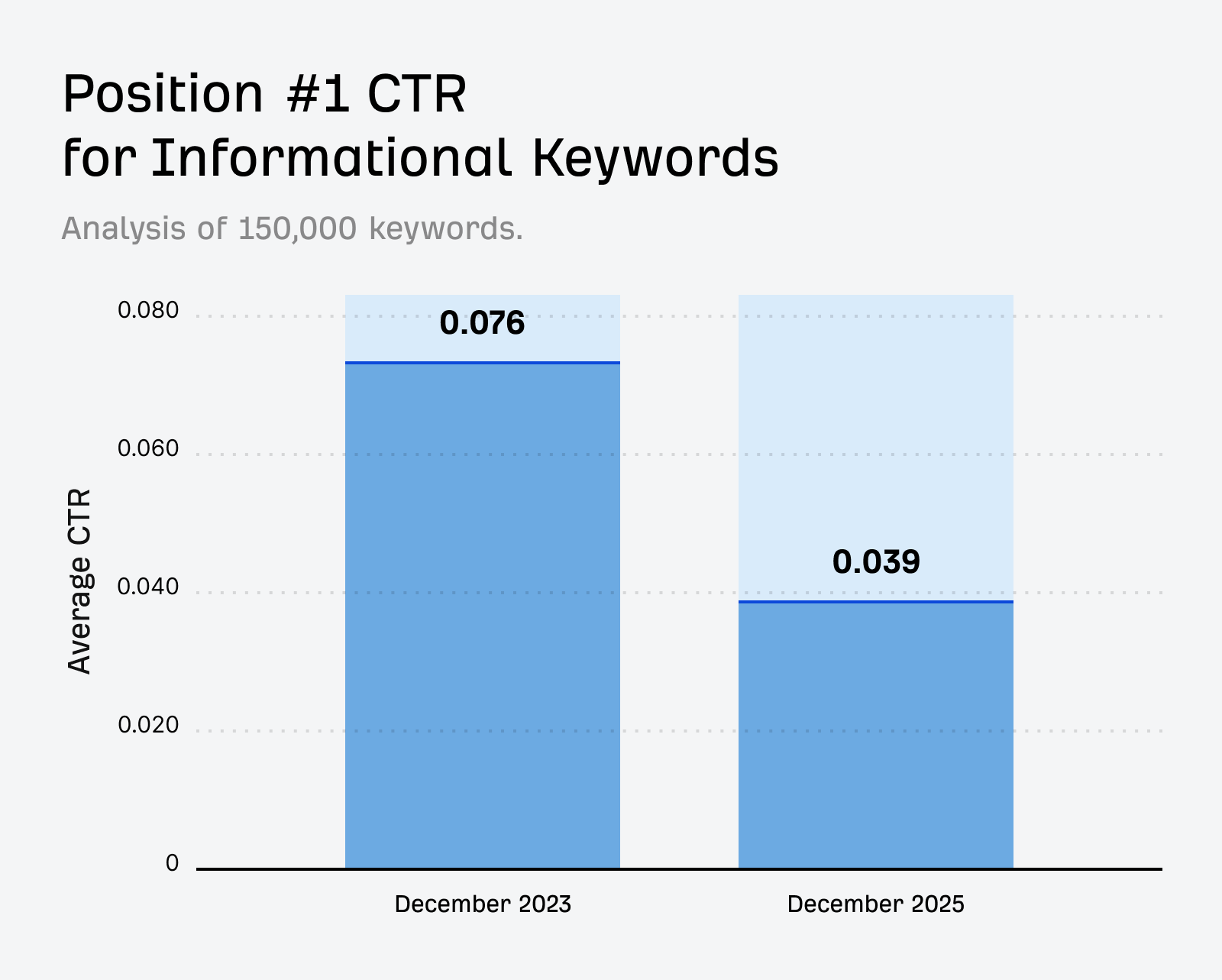 As of December 2023, the average position one CTR for information keywords was 0.076. In December 2025 this had fallen to 0.039: