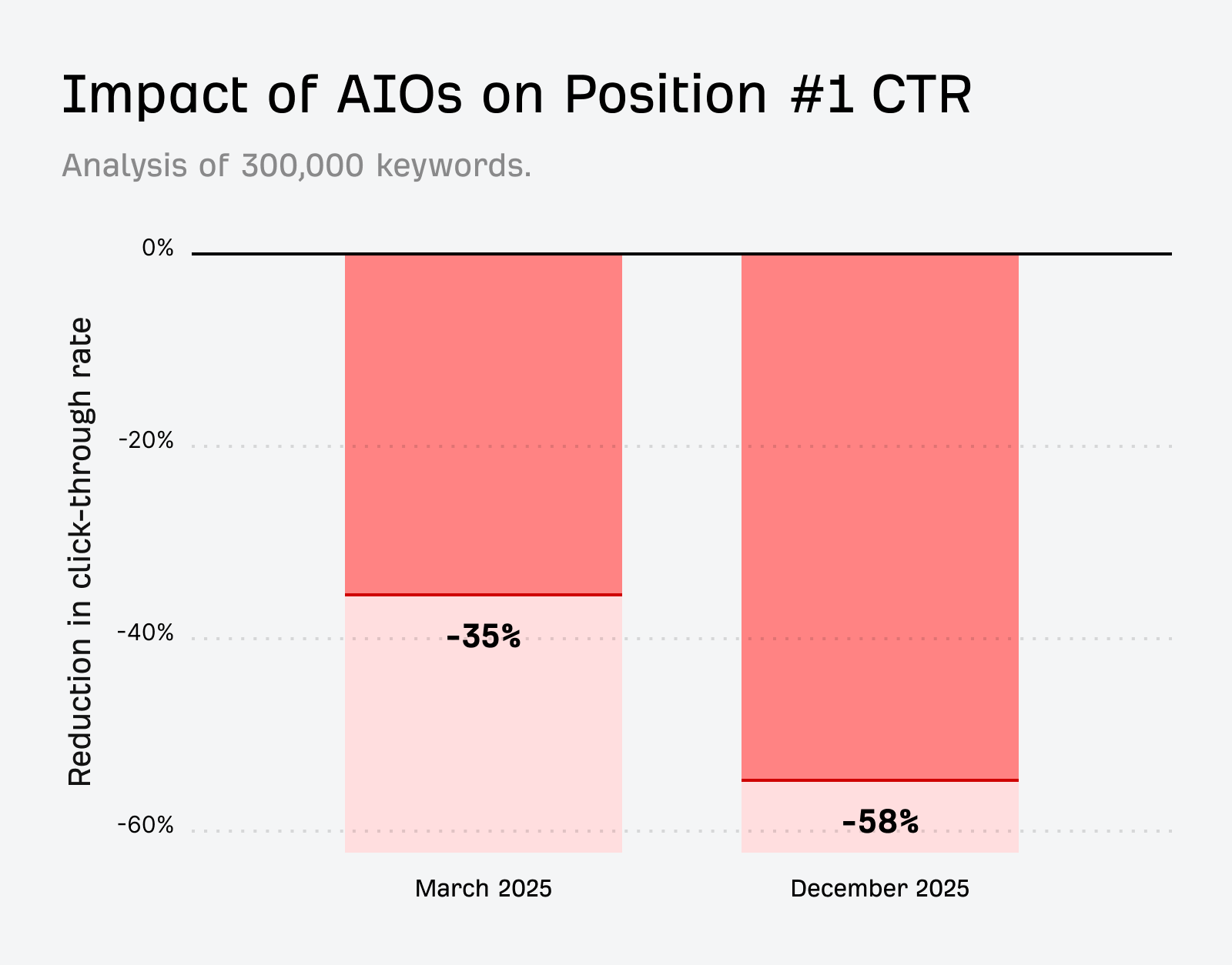 We found that having an AI overview now correlates with one 58% lower average click-through rate for the page with the highest ranking.
