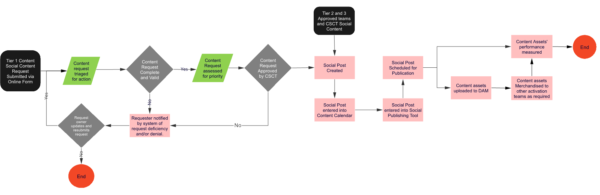 This example of a simple approval process for social content (developed for a global, multi-brand CPG company) includes three tiers. The first tier covers the process for a social content request. Tier two shows the process for producing and scheduling the content, and tier three shows the storage and success measurement for that content: