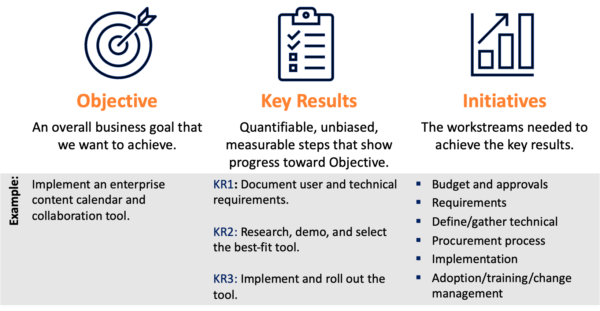 Let’s say you set an objective to implement an enterprise content calendar and collaboration tool. Key results to track might include: