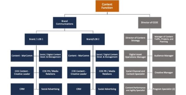Here’s a sample organizational chart we at TCA developed for a Fortune 50 firm. At the top is the content function before it diverges into two paths – one for brand communications and one for a content center of excellence.