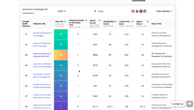 - Break down the SERP results for each suggested keyword, showing competitor weaknesses on which you can capitalize and create a better piece of content