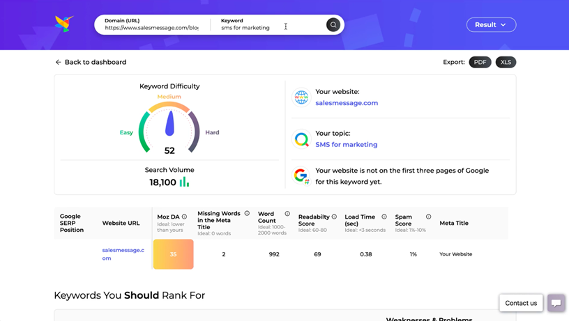 In this example, I input www.salesmessage.com/ as the URL with the keyword “sms for marketing.” The results indicate it has a medium keyword difficulty with a search volume of 18,100. It includes the Moz domain authority for the site along with the missing number of words in the meta title, word count, readability score, load time, and spam score.