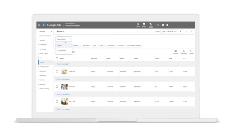 The new “Ads & assets” menu. The “Assets” page will have reports for all assets across the account. Headlines and descriptions are in the “Asset” view while the “Association” table shows segments such as images and prices. For easier viewing and performance analysis, you can also filter the reports by asset type.