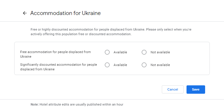 Hotel accommodations. This week, Google also released new attributes for hotel listings in Google Hotel search to define if they have free or discounted rooms available for those displaced from Ukraine. Here is a screenshot of that: