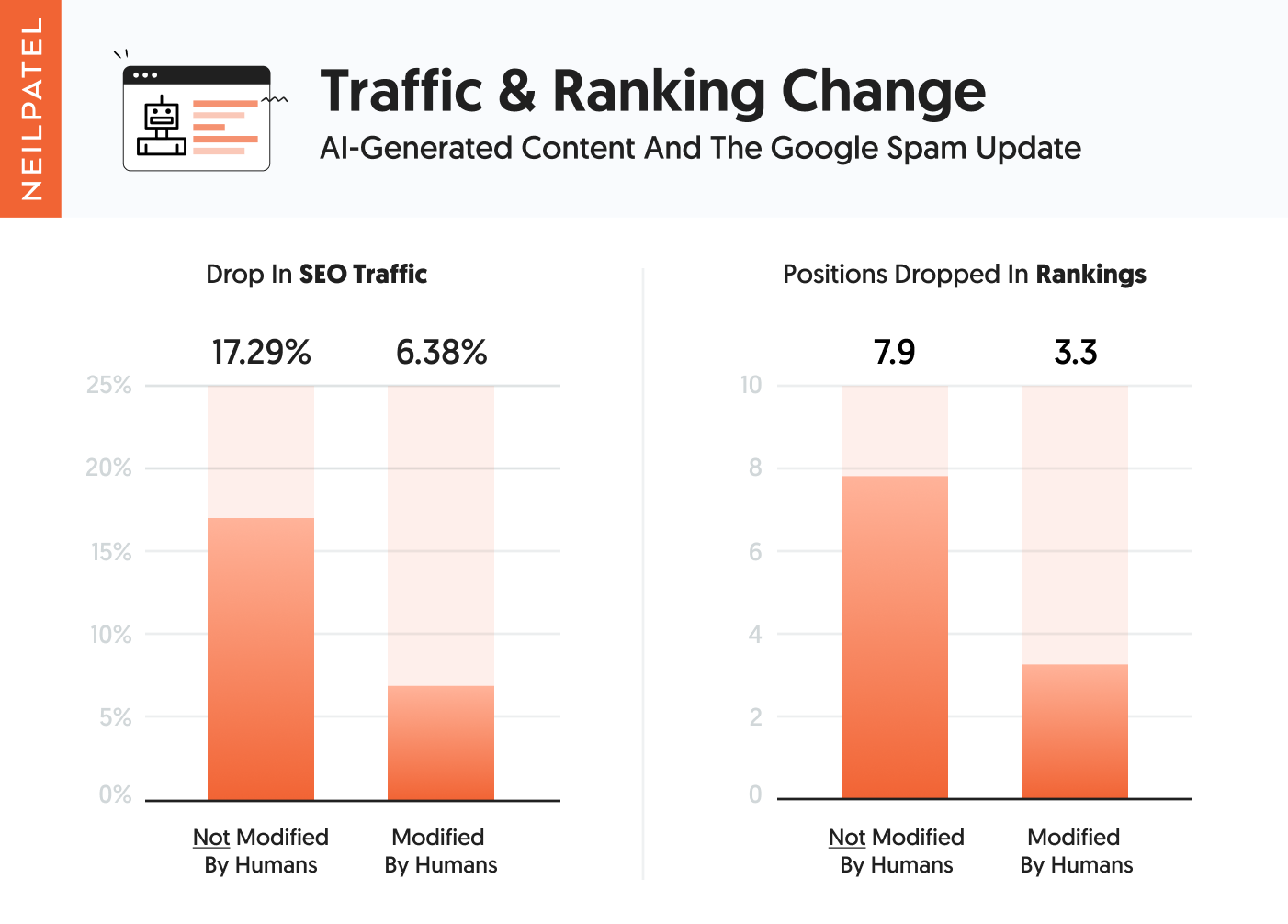 From the second group, which had humans slightly modifying the content, 8 sites were hit. They lost between 29.52% and 81.43% of their traffic. On average those 8 sites saw a 42.17% drop in traffic.