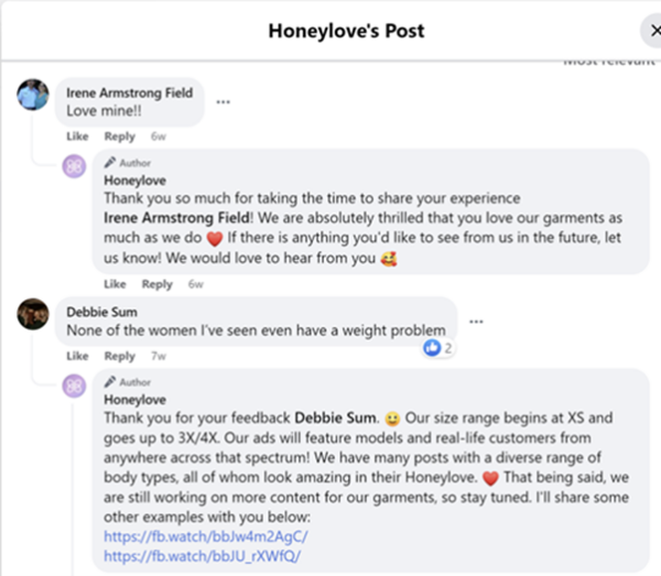 Honeylove, a shapewear clothing brand, thoughtfully replies to every comment – ​​positive, negative, or neutral – on its Facebook page. In this post, it tackles all three: