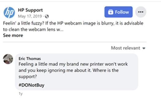 The post topic (how to fix a fuzzy HP webcam) isn’t what the commenter talked about (a new printer that won’t work and HP’s ignoring his support inquiries. However, it presented the perfect opportunity for HP Support to live up to his name, reply, and move to a one-on-one conversation.While Eric Thomas (the commenter) may never have been satisfied, I wouldn’t have seen HP’s lack of support confirmed three years later after a Google search delivered this content to help solve a problem with my webcam.