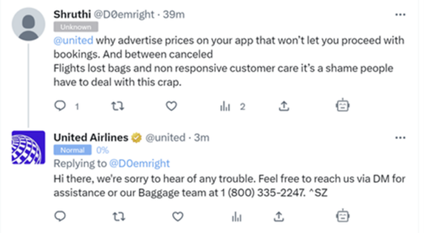 In this tweet, a customer tags United Airlines and complains about its advertised pricing promises, lost luggage, and non-responsive customer service, concluding, “It’s a shame people have to deal with this crap.” United responded with an apology and a request to contact them via direct message or by the phone number provided.