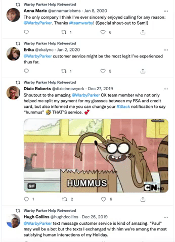 For example, Warby Parker, the online prescription glasses and sunglasses retailer, has an amazing customer service reputation. the Warby Parker Help Twitter handle frequently retweets positive comments from customers who appreciate the brand’s quick response to customer queries.