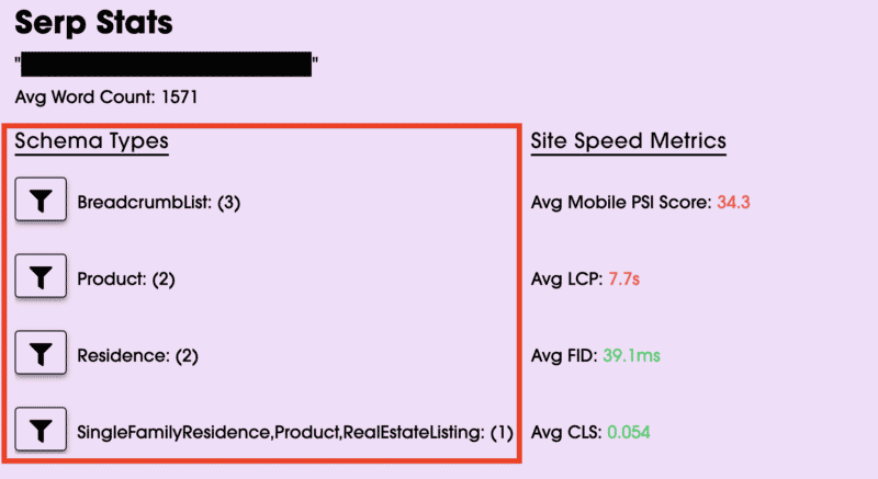 Step 1: Enter a keyword and allow the tool to run. Once completed, all schema types will be nicely aggregated at the top of the page, along with the number of times each is used and some site speed metrics.