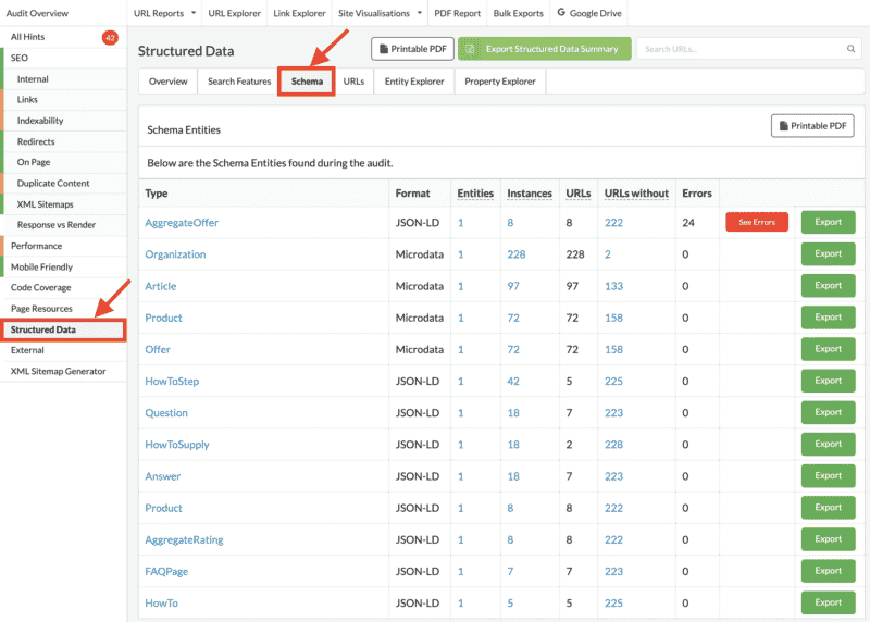 While other tools offer schema insights during their crawls, I have found Sitebulb to provide a better output of that data.