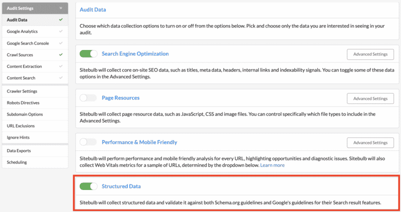 When starting your site crawl, ensure the Structured Data slider is selected in the audit data section. Select your other requirements and click Start Audit.
