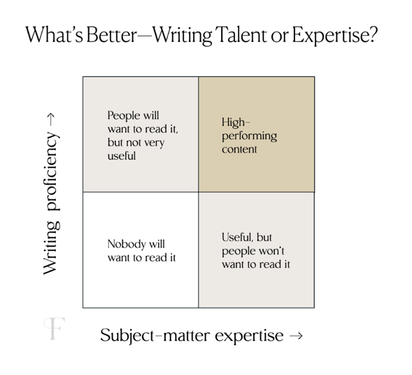This chart reflects that concept as the y-axis indicates writing proficiency and the x-axis is about subject matter expertise. Someone who is highly proficient with lesser expertise will create content people will read but not find very useful, while someone who is an expert but not a proficient writer will create useful content, but people won’t want to read it.