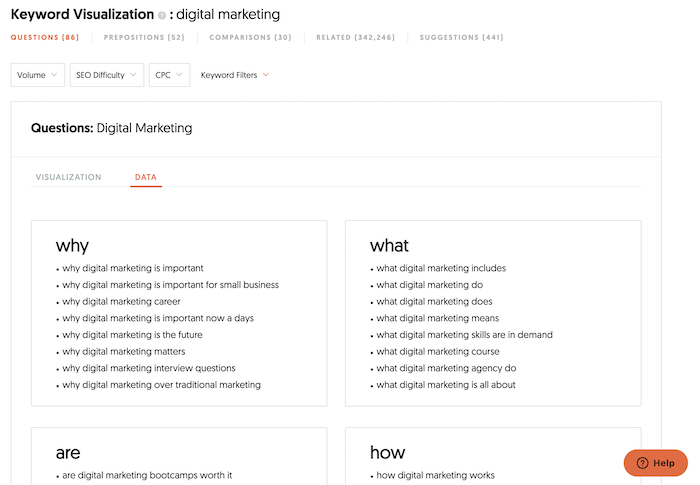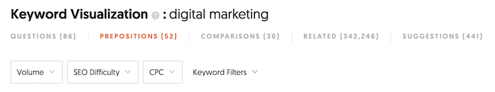 What’s also cool about this report is you can filter results by questions, prepositions, comparisons, related keywords, or just suggestions (from Google Suggest).