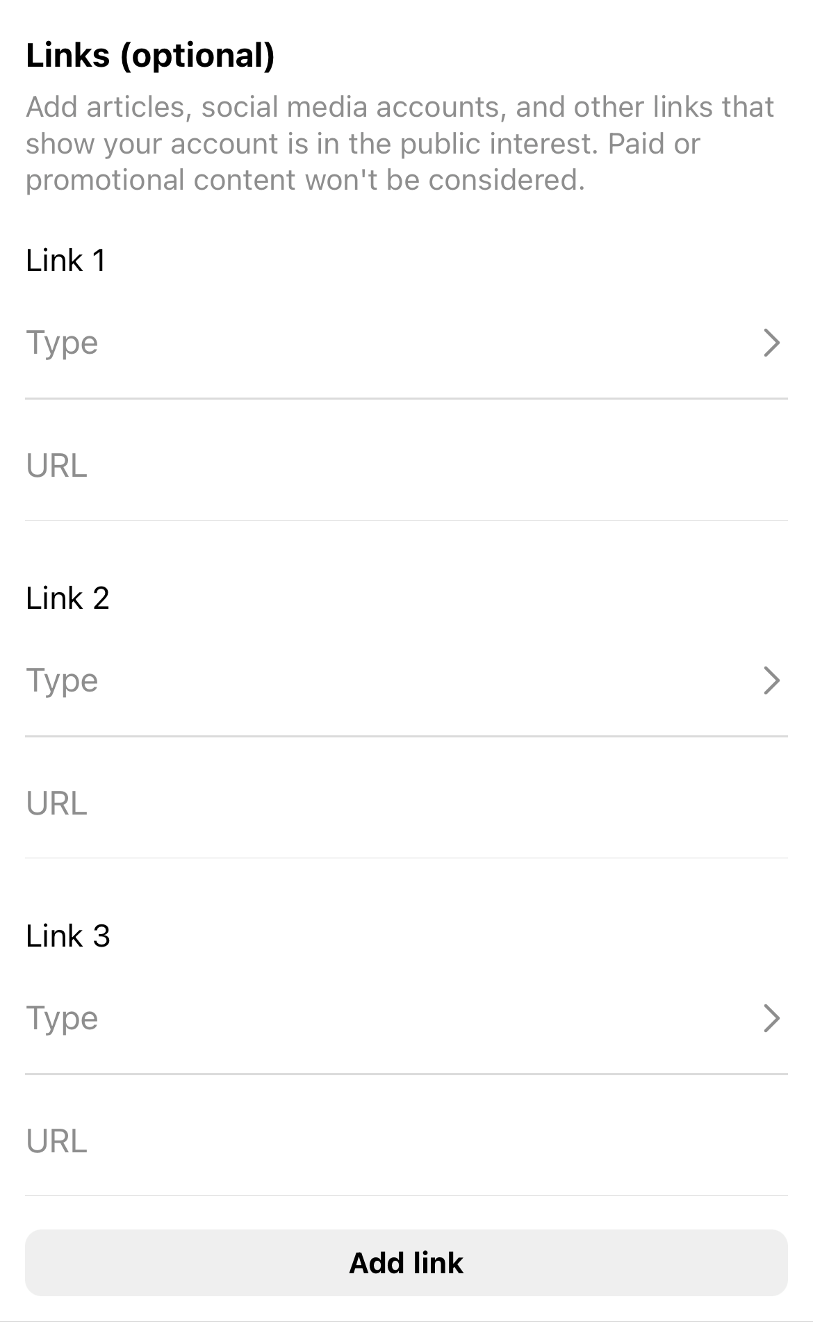 Finally, you can add links to your application to prove your notability. This is technically optional but we highly recommend it if you want to successfully get verified on Instagram.