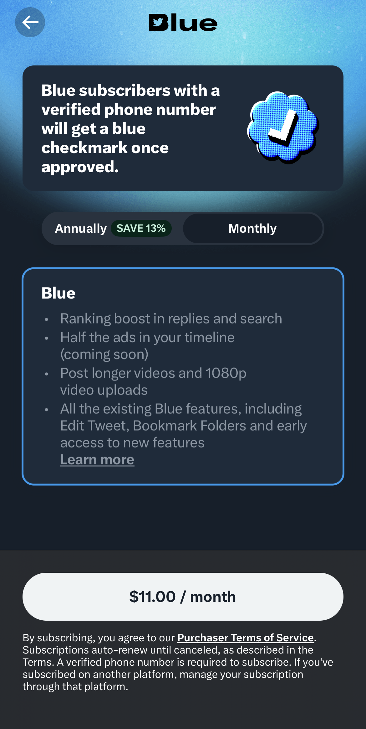 You can select to pay annually (for a discount) or monthly. The price of Twitter Blue depends on a few things.