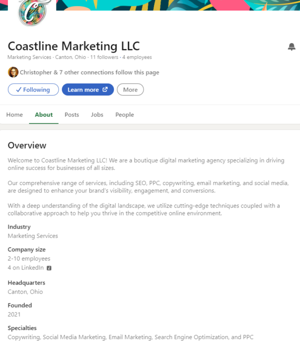 Choose up to 20 specialties to add to your company page that represents what you do and what you post about. Think of these as “hashtaggable” keywords to help your page be found more easily on the platform.