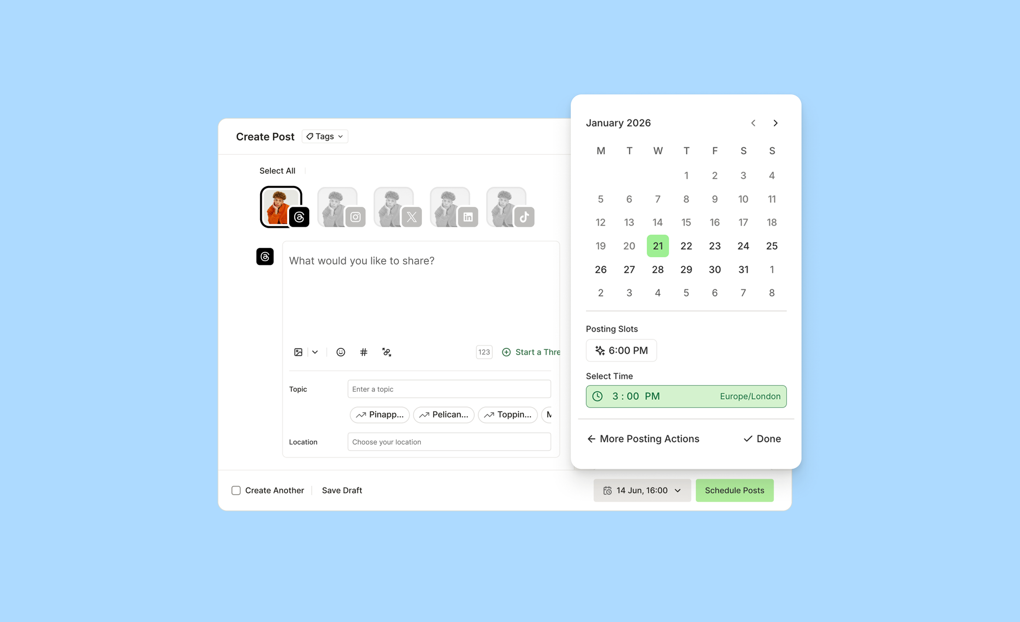 Crosspost to other platforms. Create once in the buffer, publish to threads and everywhere else at the same time. Or customize it for each channel.