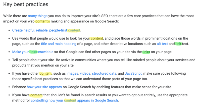 In Google Search Essentials, the “key best practices” section mentions content six times including on top while links are mentioned only three times: