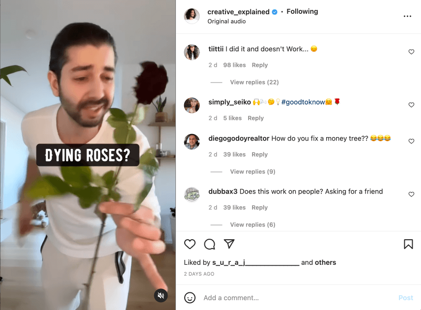 To give you an example of how this would look in real life, let’s take a look at this Instagram Reels video from Armen Adamjan of Creative Explained. In it, he explained how to revive dying roses.
