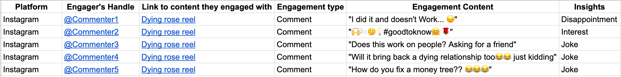 To start tracking engagement quality, take note of every time someone talks about how you’ve helped them, asks you questions, or leaves you a review. Then track the following data points in a spreadsheet: