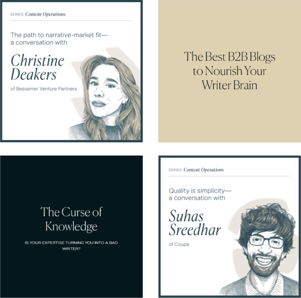 Fenwick, for example, relies on a freelancer to do delicate line drawings, such as the images below for Christine Deakers and Suhas Sreedhar who were profiled in a series on content operations.
