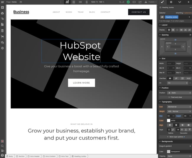 Webflow is a visual platform that lets you build websites using its intuitive drag-and-drop tool. It is a tool that is best for people who want something with little to no coding experience required and is low maintenance. Here is an example of what the site editor looks like.