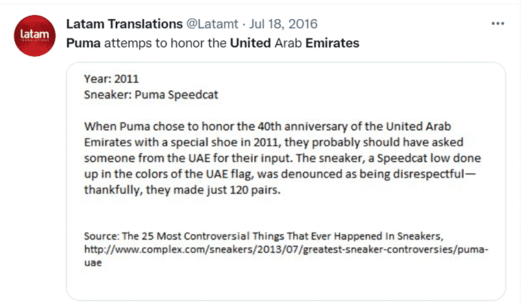 The sentiment created a backlash because the Arabic culture sees the shoe as something that comes in contact with the ground. It’s dirty. For example, throwing a shoe at another is seen as a sign of great disrespect in the UAE. So, imagine how seeing the country’s colors on a shoe went over.