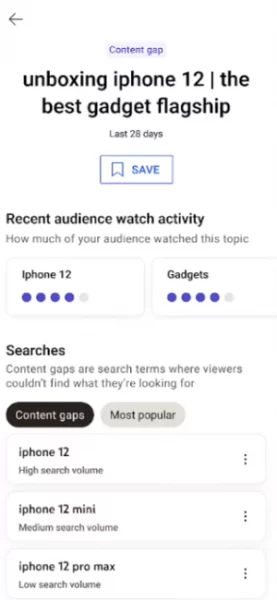 Personal insights. The second new element is new personalized insights based on your audience’s unique interest or your saves. YouTube is looking to provide additional engagement data to help with planning while also displaying interest in other niches.